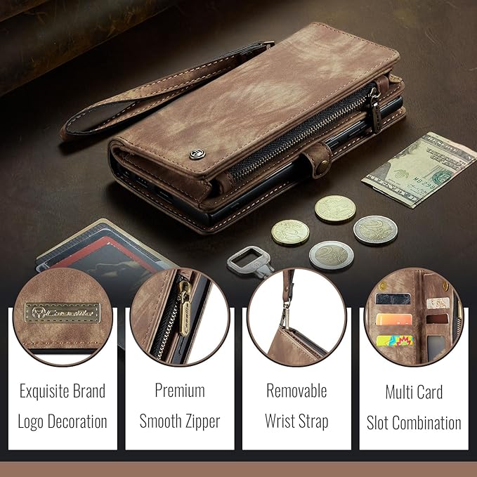 SZHAIYU 2 in 1 Detachable for Samsung Galaxy S25 Ultra Wallet Case with Card Holder, Retro Premium Flip Leather Cover Magnetic Zipper Pocket Phone Cases 6.8'' (Coffee, S25 Ultra)