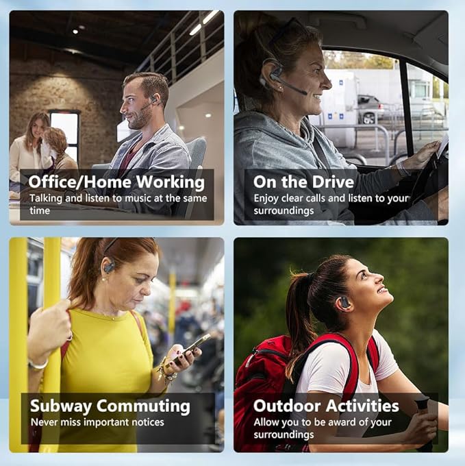 - 【Dual Connection & Physical Button Controls】With Bluetooth multipoint technology, the open ear headphones with microphone can connect two devices at once, and switch seamlessly between your phone and laptop to keep your workflow smooth and uninterrupted. Wireless earbud features a physical multi-functional button, very convenient to play/pause music, skip tracks, volume +/-, activate voice assistant, answer/hang up/reject phone calls, mute on/off, while also preventing accidental touches.