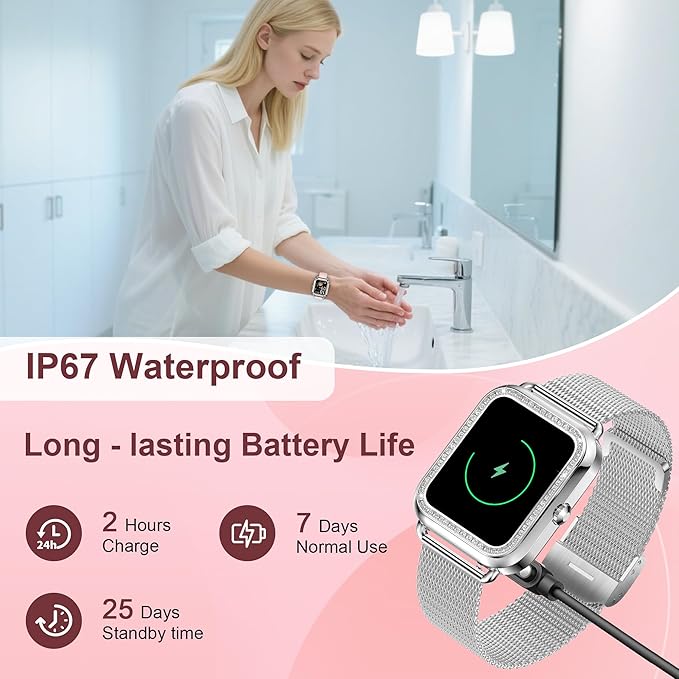 - 【Waterproof and Warm Multifunction】IP67 waterproof, no need to take off the waterproof watch when washing hands, meeting daily waterproof requirements. There are weather forecast, drinking water & sedentary reminders, music & camera control, find phone, women's menstrual cycle, etc. All-round care for you. 2.5h USB magnetic fast charge, 3-7 Days long battery life (Different usage habits, different usage time).