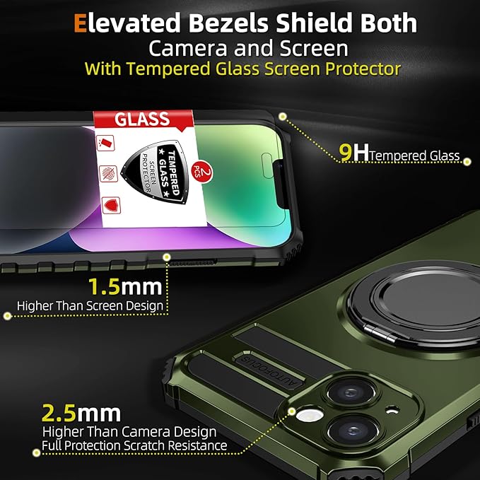 - 【Built-in Multifunctional Kickstand Ring】iPhone 13 Built-in 360° rotatable magnetic stand,It is an excellent three -way solid and practical bracket box, built -in convenient 360° bracket, which is made of light and solid aviation -grade aluminum. This protective shell can firmly support your phone under vertical and horizontal mode, Based on ergonomic design, it provides your best perspective. The bracket can also hold it more easily with one hand.