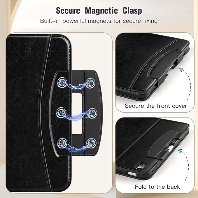 - Auto Wake/Sleep & Secure Magnetic Clasp: Magnetic smart cover supports auto wake/sleep function. The powerful magnetic clasp secures the a16 iPad case when closed and flips to attach magnetically to the back cover when opened