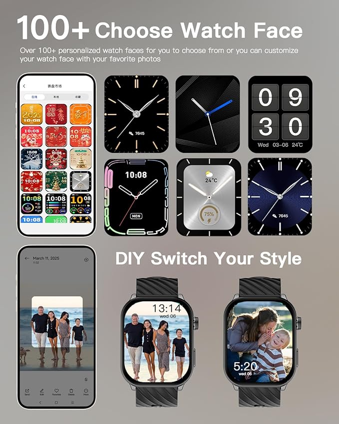 - Fitness Tracker with 100+ Sports Modes: The fitness watch supports 100+ sports modes (running, cycling, yoga, basketball, walking, etc.), and monitors data in real time during exercise, such as steps, distance, calorie consumption, heart rate and blood oxygen exercise time to help adjust the training intensity to achieve better exercise results.(Note: Avoid hot showers or swimming while wearing the watch).