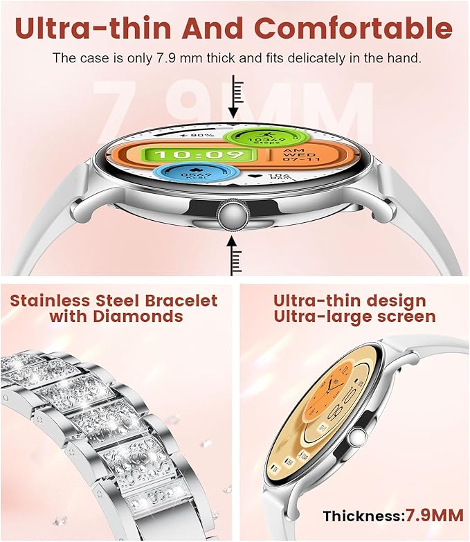 - 【Sleek & Luxurious Design】This lightweight silm smart watches for women (7.9mm thin) is designed with ergonomics for maximum comfort. It’s the perfect accessory for women who value both style and functionality, whether during workouts or everyday activities. The stunning diamond-studded metal band adds a luxurious, jewelry-like feel—far beyond ordinary silicone or mesh straps. Sparkling with every movement, it transforms your smartwatch into a statement piece, perfect for both casual and formal occasions. Elevate your style effortlessly while enjoying cutting-edge technology at your fingertips. (Includes instructional videos to help you get started.)