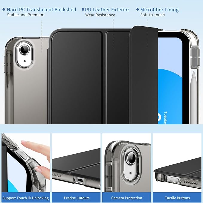 - Auto Sleep/Wake Function: The slim iPad case 10th generation supports auto sleep and wake feature, open or close the case, wake up the tablet or put it into sleep, save battery power and extend the use time. Precise cutouts support Touch ID functionality, and easy access to buttons, ports, speakers and more