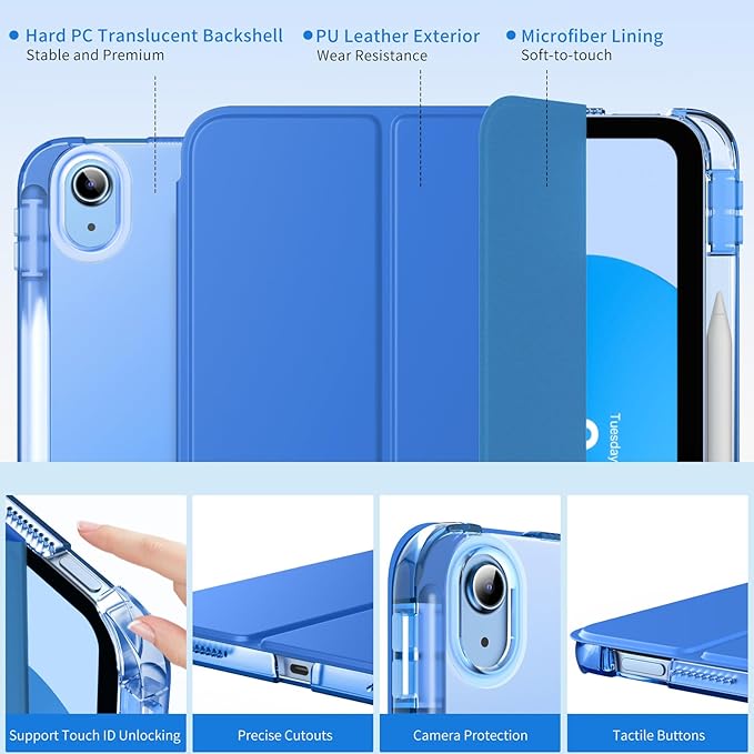 - Auto Sleep/Wake Function: The slim iPad case 10th generation supports auto sleep and wake feature, open or close the case, wake up the tablet or put it into sleep, save battery power and extend the use time. Precise cutouts support Touch ID functionality, and easy access to buttons, ports, speakers and more