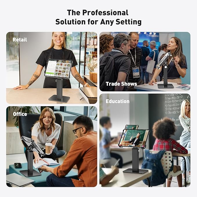 - Universal Compatibility for iPads and Tablets: This ipad commercial stand is compatible with 9.7"–13" tablets, including iPad, iPad Pro, iPad Air, and Samsung Galaxy Tabs. Easily adjustable to fit various devices, it offers a tablet stand for retail and tablet register mount solution for businesses, events, and customer service counters.