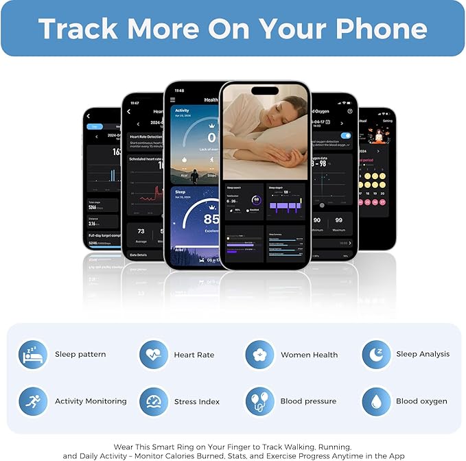 - Track Sleep and Activity: Monitor your daily steps, distance, and calories with this fitness ring. The sleep tracker ring keeps tabs on sleep duration and stages, ideal for fitness rings for women and fitness rings for men