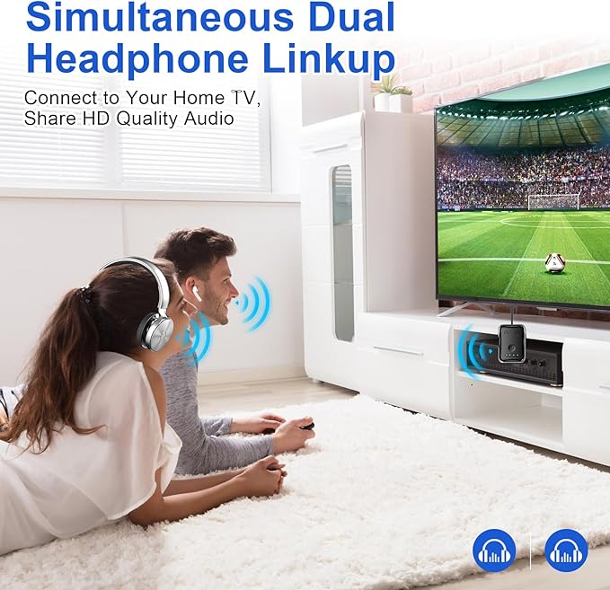 - Wide Compatibility: The bluetooth transmitter for tv is super compatible. It works with AUX/RCA - output audio devices like those on planes, TVs, PCs, and gym equipment. It can connect to any headsets and earbuds (such as AirPods 1/2/3/Pro). The included dual 3.5mm adapter of the tv bluetooth transmitter enables it to be used on any flight, regardless of the connector type