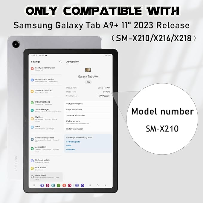 - 【Exclusively Designed for Samsung Galaxy Tab A9+】This case is tailor-made for the Samsung Galaxy Tab A9+ 11 inch 2023 Release (SM-X210/X216/X218).NOT compatible with any other model devices.Double-check your model number in tablet settings before purchase.[NO Screen Protector!!]