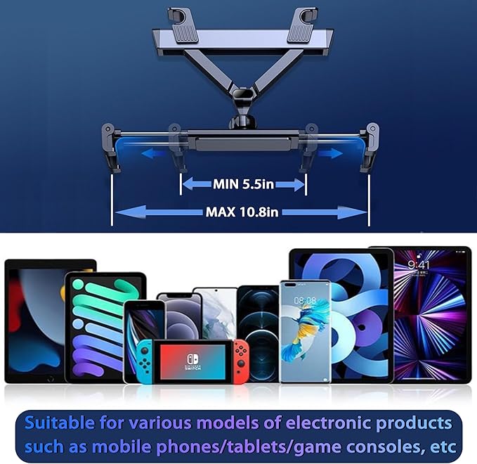 - WIDE DEVICES COMPATIBILITY: The headrest tablet holder is compatible with all 5.3-10.6 inch devices (Clamp Opening 5.5-10.8 inches, Fits Larger Tablets - If Width/Height/Short Side ≤10.6". Assuming the short side of the 17 inch tablet is 10 inches, it can still be clamped), such as iPad Pro / iPad mini / iPad Air / iPad / iPhone / Galaxy Tab / Fire HD... and more