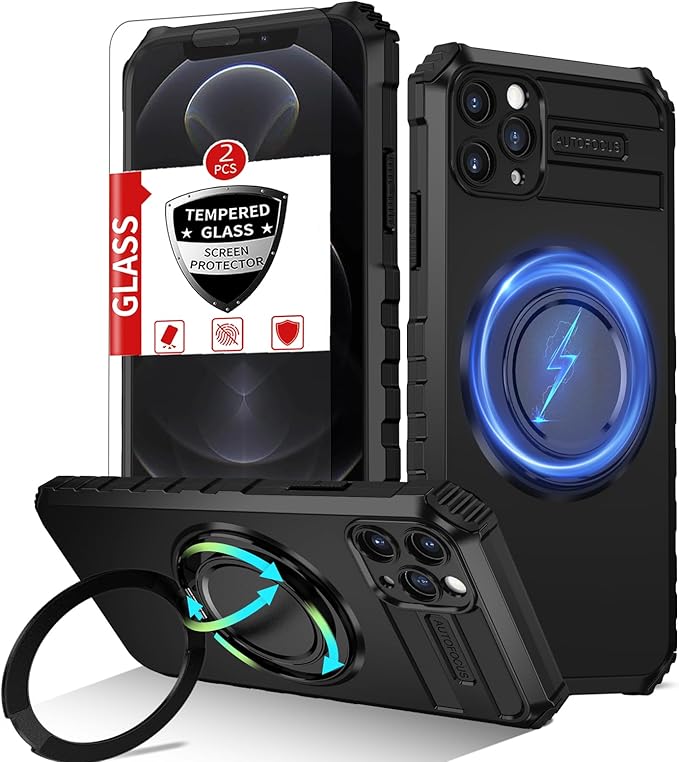 for iPhone 12 Pro Case Compatible with MagSafe Magnetic,with 2 Screen Protectors,Built-in 360° Kickstand Ring,Military Grade Drop Shockproof Heavy Duty Protection for 12 Pro Phone Case Black
