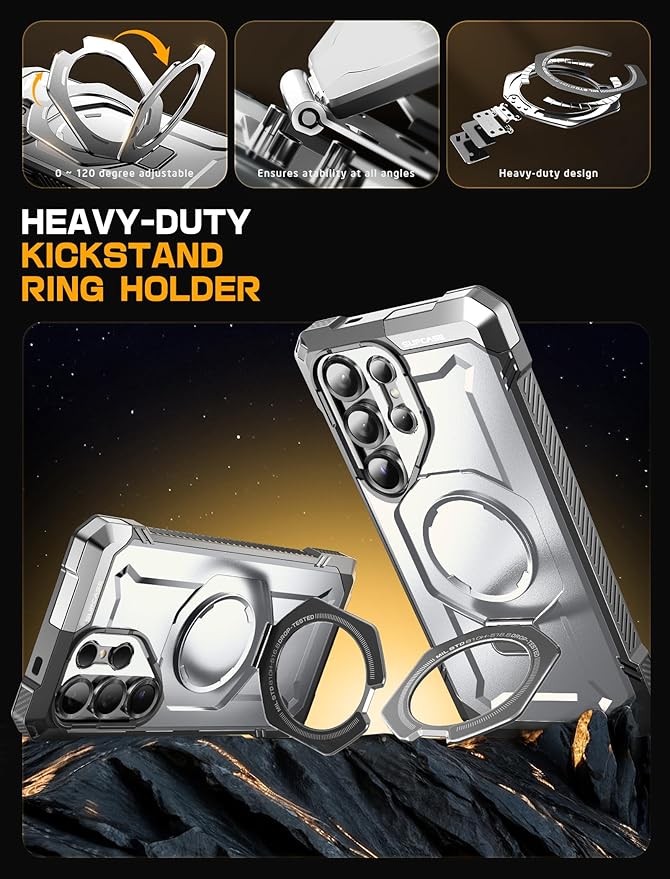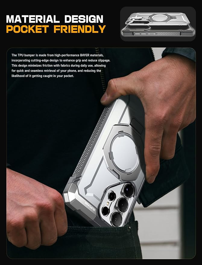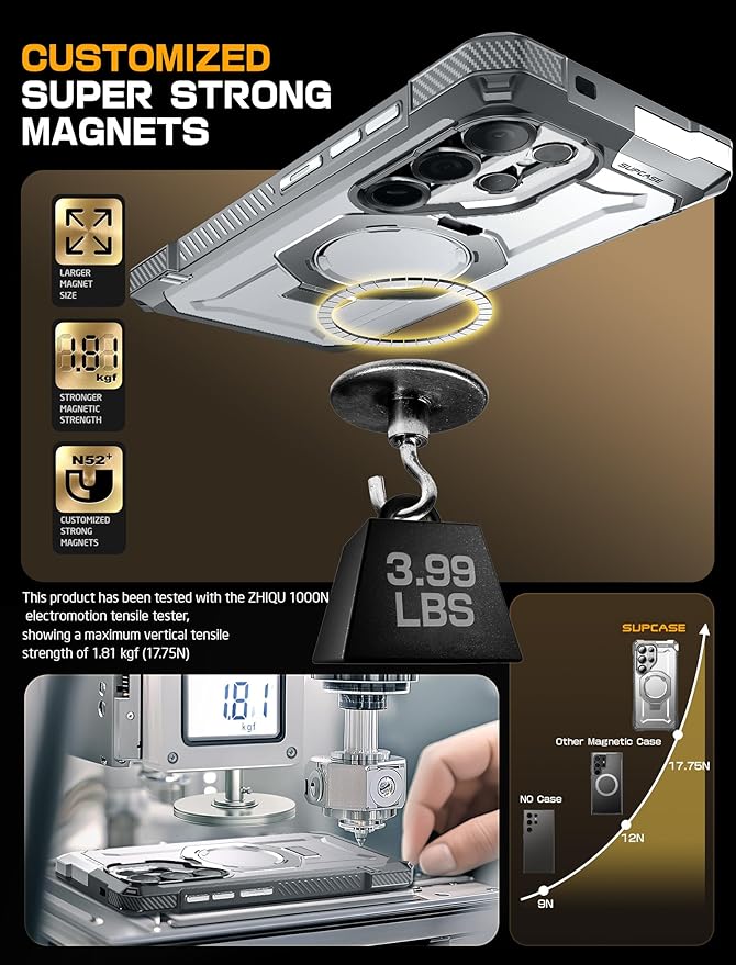 - Built-in aluminum alloy kickstand offers multiple viewing angles. Equipped with an N52 powerful magnet, delivering a magnetic force of up to 1500g ensuring seamless compatibility with MagSafe accessories (magnetic car mount, MagSafe wireless charger, magnetic card holder, desktop magnetic wireless charging stand).
