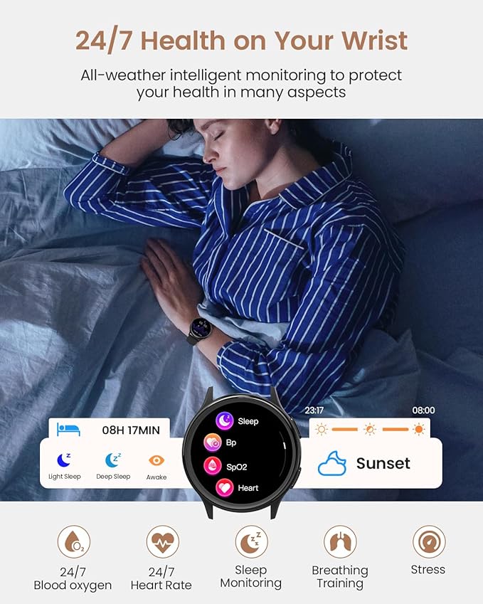 - 【Advanced Health Monitoring】- Stay on top of your well-being. Equipped with the latest sensors, this smart watches for women ans men tracks your heart rate, blood oxygen levels, sleep quality, stress levels, and even your mood. Stay informed about your health and make smarter lifestyle choices with real-time data(The product is not a medical device and the data cannot be compared to medical device data)