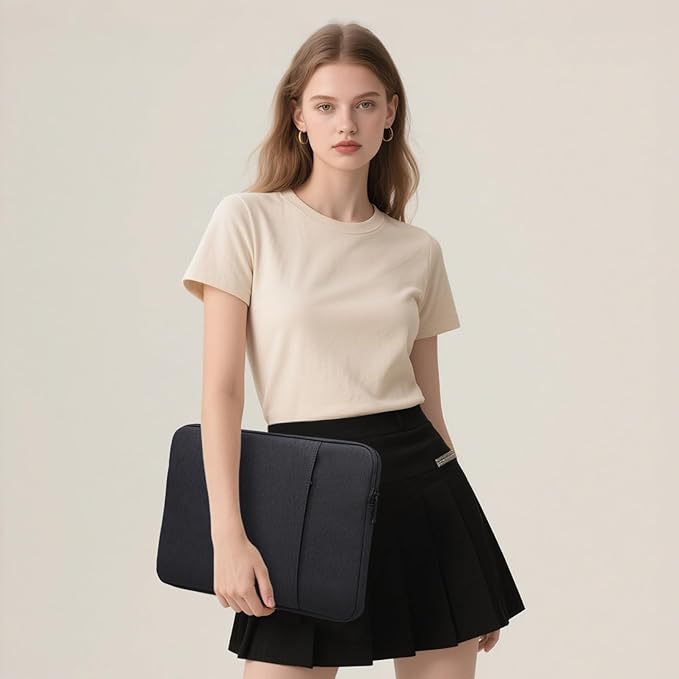 - 360° Multi-layer Superior Protection: The outer fabric is made of 1200D polyester fabric, which is water-resistant, scratch-resistant and wear-resistant. The middle layer is padded with 5mm thickness to absorb bumps and shocks. The soft velvet lining protects your laptop from scratches when you take your laptop out/in. There is also a 2cm wide protective ridge all around. As a result, your laptop is always tightly wrapped and protected with 360° multiple protection