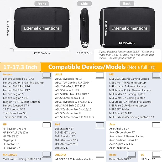 - Internal Dimensions: 16.53" x 11.81" x 0.79". Compatible with HP Laptop 17, HP Pavilion/ENVY/OMEN/Flagship 17, ASUS VivoBook (Pro) 17, ASUS ChromeBook 17.3, ASUS ZenBook Pro 17, ASUS ROG Strix Scar 17, ASUS TUF Gaming F17, Dell Precision/XPS 17, Dell Alienware M17/M18, Lenovo Ideapad 3 3i 17.3, Lenovo ThinkPad P17, Lenovo Legion 17.3, Acer Chromebook/Nitro/Aspire 5 17, Acer Predator (Helios) 17, MSI Gaming Laptop 17, Razer Blade 17/18, MALLRACE Gaming Laptop 17.3, LG Gram 17, etc.