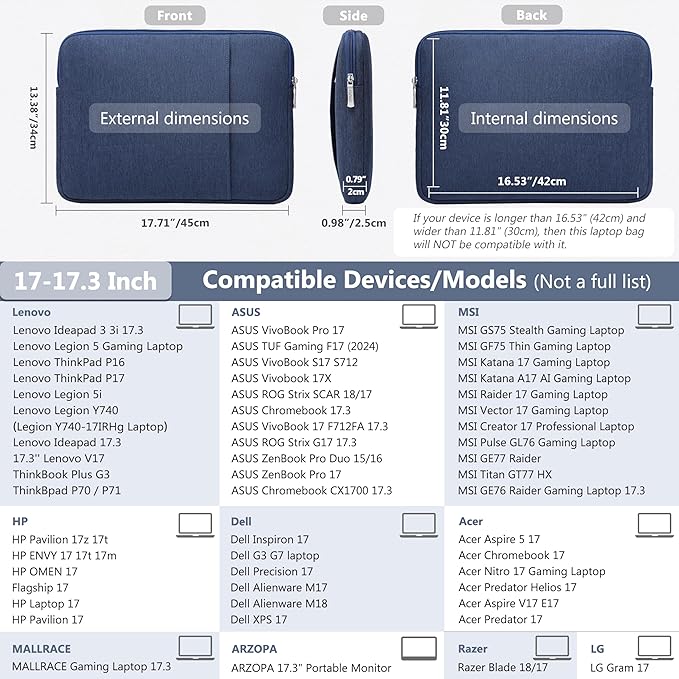 - Internal Dimensions: 16.53" x 11.81" x 0.79". Compatible with HP Laptop 17, HP Pavilion/ENVY/OMEN/Flagship 17, ASUS VivoBook (Pro) 17, ASUS ChromeBook 17.3, ASUS ZenBook Pro 17, ASUS ROG Strix Scar 17, ASUS TUF Gaming F17, Dell Inspiron/Precision/XPS 17, Lenovo Ideapad 3 3i 17.3, Lenovo ThinkPad P17, Lenovo Legion 17.3, Acer Chromebook/Nitro/Aspire 5 17, Acer Predator (Helios) 17, MSI Gaming Laptop 17, Razer Blade 17/18, MALLRACE Gaming Laptop 17.3, LG Gram 17, etc.