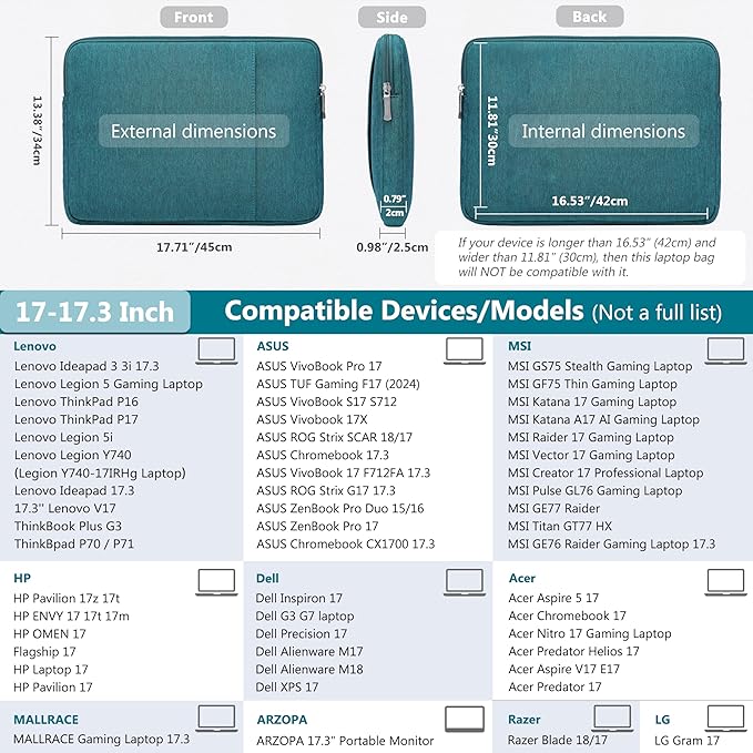 - Internal Dimensions: 16.53" x 11.81" x 0.79". Compatible with HP Laptop 17, HP Pavilion/ENVY/OMEN/Flagship 17, ASUS VivoBook (Pro) 17, ASUS ChromeBook 17.3, ASUS ZenBook Pro 17, ASUS ROG Strix Scar 17, ASUS TUF Gaming F17, Dell Precision/XPS 17, Dell Alienware M17/M18, Lenovo Ideapad 3 3i 17.3, Lenovo ThinkPad P17, Lenovo Legion 17.3, Acer Chromebook/Nitro/Aspire 5 17, Acer Predator (Helios) 17, MSI Gaming Laptop 17, Razer Blade 17/18, MALLRACE Gaming Laptop 17.3, LG Gram 17, etc.