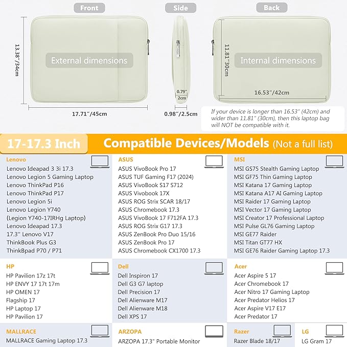 - Internal Dimensions: 16.53" x 11.81" x 0.79". Compatible with HP Laptop 17, HP Pavilion/ENVY/OMEN/Flagship 17, ASUS VivoBook (Pro) 17, ASUS ChromeBook 17.3, ASUS ZenBook Pro 17, ASUS ROG Strix Scar 17, ASUS TUF Gaming F17, Dell Inspiron/Precision/XPS 17, Dell Alienware M17/M18, Lenovo Ideapad 3 3i 17.3, Lenovo ThinkPad P17, Lenovo Legion 17.3, MSI Gaming Laptop 17, Razer Blade 17/18, MALLRACE Gaming Laptop 17.3, LG Gram 17, etc.