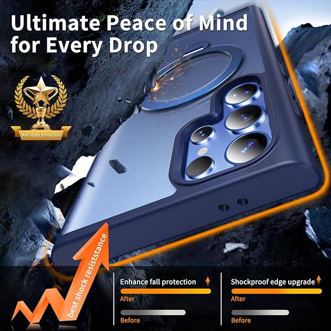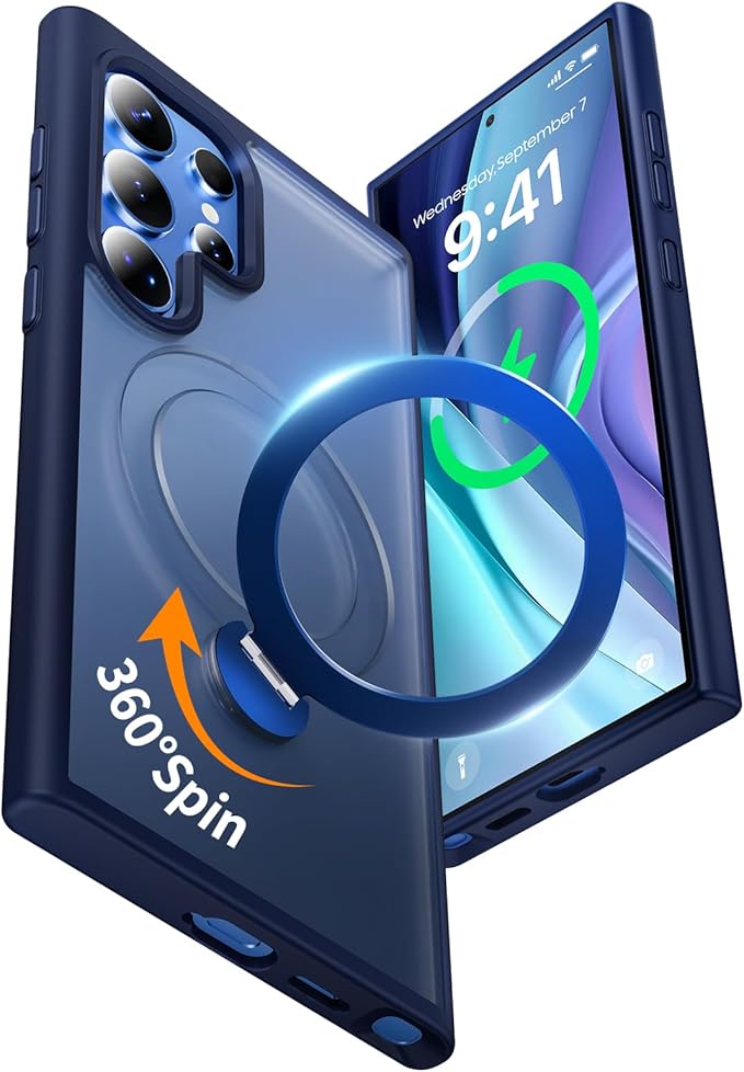 - 【All in One: Magnetic, Stand, Ring Holder】for Samsung S24 ultra case, a groundbreaking case that integrates magnets, a 360°spin kickstand also as a ring holder, Comprehensive protection, and it holds my phone upright or sideways for Facetime, video chat. As a phone ring holder grip, I can hold the ring with one finger to grip the phone securely when I get my hands full!It shortens overall charging time and further improves your wireless charging experience