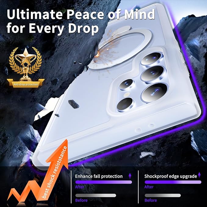 - 【All in One: Magnetic, Stand, Ring Holder】for Samsung S23 Ultra case, a groundbreaking case that integrates magnets, a 360°spin kickstand also as a ring holder, Comprehensive protection, and it holds my phone upright or sideways for Facetime, video chat. As a phone ring holder grip, I can hold the ring with one finger to grip the phone securely when I get my hands full!It shortens overall charging time and further improves your wireless charging experience