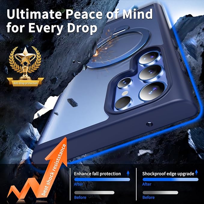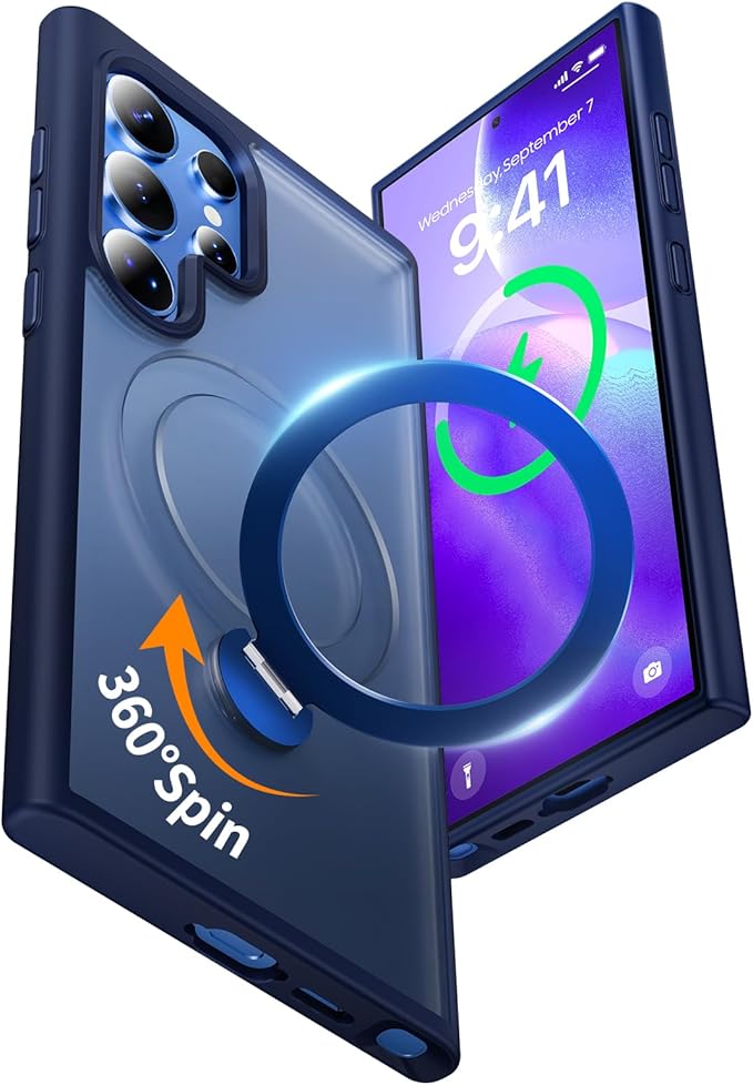 - 【All in One: Magnetic, Stand, Ring Holder】for Samsung S23 Ultra case, a groundbreaking case that integrates magnets, a 360°spin kickstand also as a ring holder, Comprehensive protection, and it holds my phone upright or sideways for Facetime, video chat. As a phone ring holder grip, I can hold the ring with one finger to grip the phone securely when I get my hands full!It shortens overall charging time and further improves your wireless charging experience