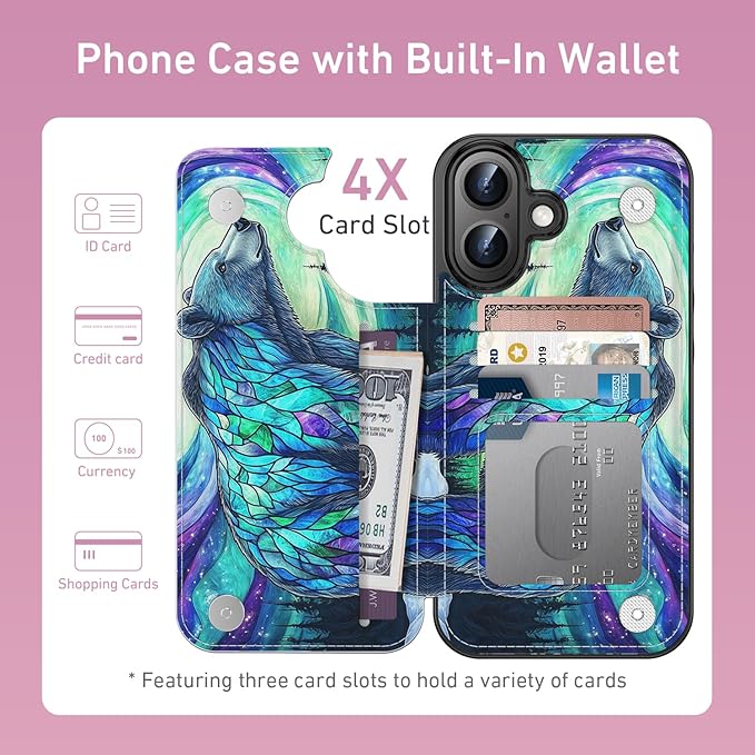 FUNMIKO for iPhone 16 Plus Wallet Case with Card Holder, RFID-Blocking, Military-Grade Protection & UV-Printed Artwork, Magnetic Closure with Leather Kickstand - Prismatic Aurora Bear
