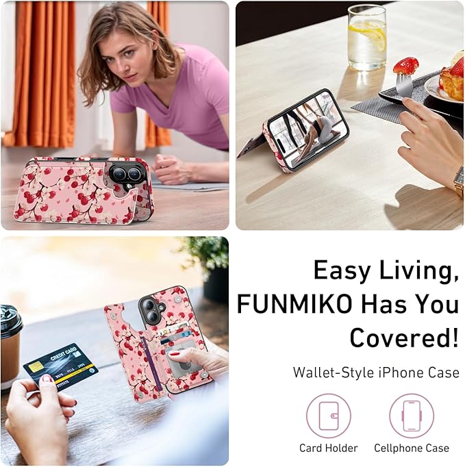 FUNMIKO for iPhone 16 Wallet Case with Card Holder, RFID-Blocking, Military-Grade Protection & UV-Printed Artwork, Magnetic Closure with Leather Kickstand - Cherry Blossom