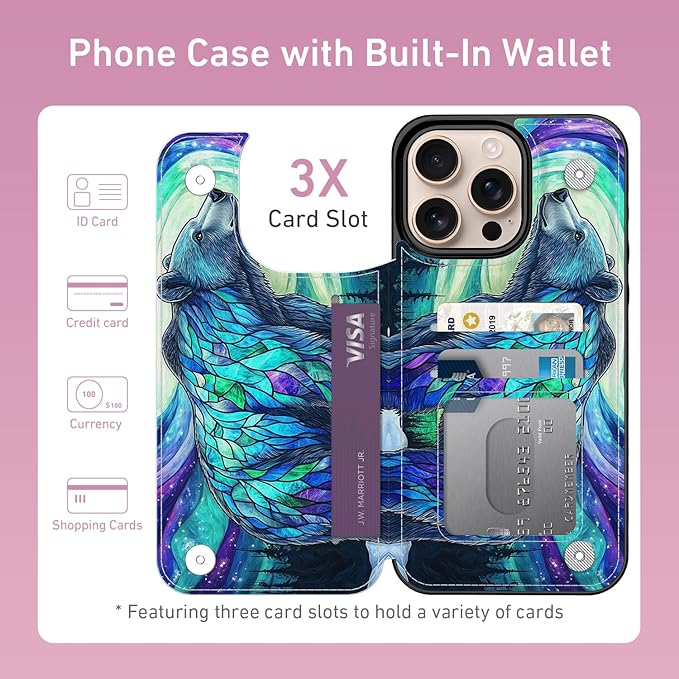 FUNMIKO for iPhone 16 Pro Wallet Case with Card Holder, RFID-Blocking, Military-Grade Protection & UV-Printed Artwork, Magnetic Closure with Leather Kickstand - Prismatic Aurora Bear