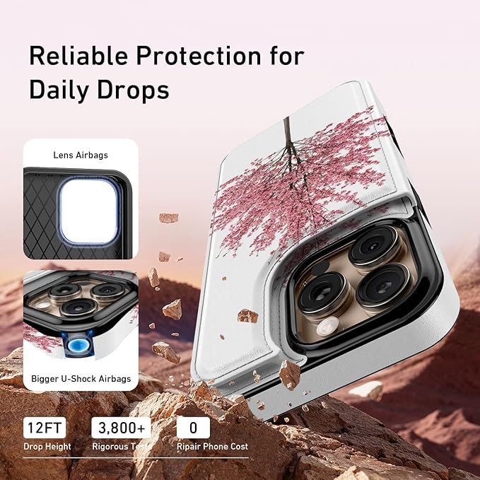 - Military-Grade MIL-STD-810G Protection - Crafted with premium leather and reinforced shock-absorbent corners, this iPhone 16 Pro Max case offers military-grade MIL-STD-810G protection against drops of up to 1.2 meters, making it ideal for daily adventures or accidental slips. Additionally, it features a 5,000+ cycle magnetic clasp for instant, secure closure and 45° to 90° adjustable kickstand for binge-watching, video calls, or reading—all designed for convenient one-hand operation.