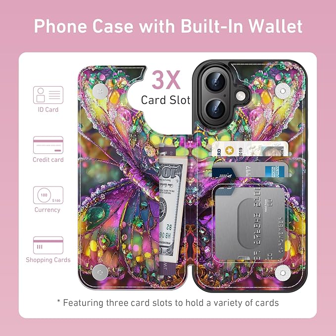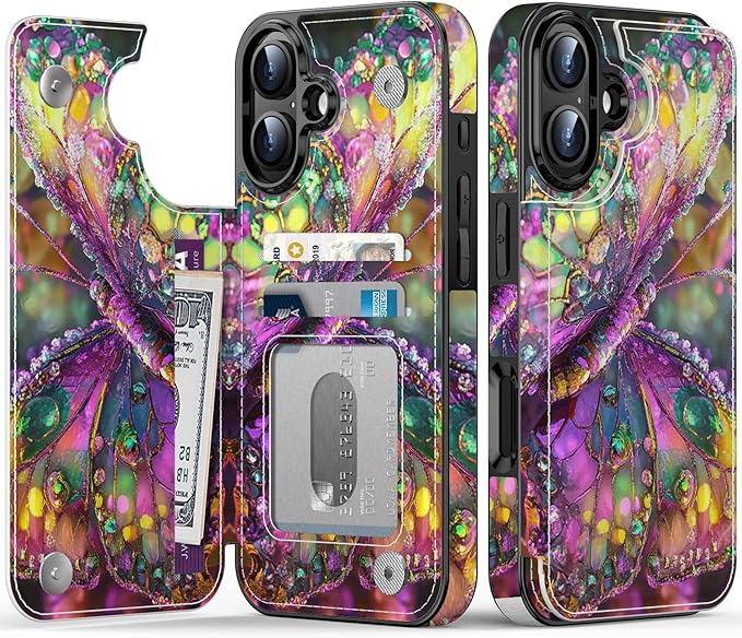 FUNMIKO for iPhone 16 Wallet Case with Card Holder, RFID-Blocking, Military-Grade Protection & UV-Printed Artwork, Magnetic Closure with Leather Kickstand - Vibrant Elegant Butterfly