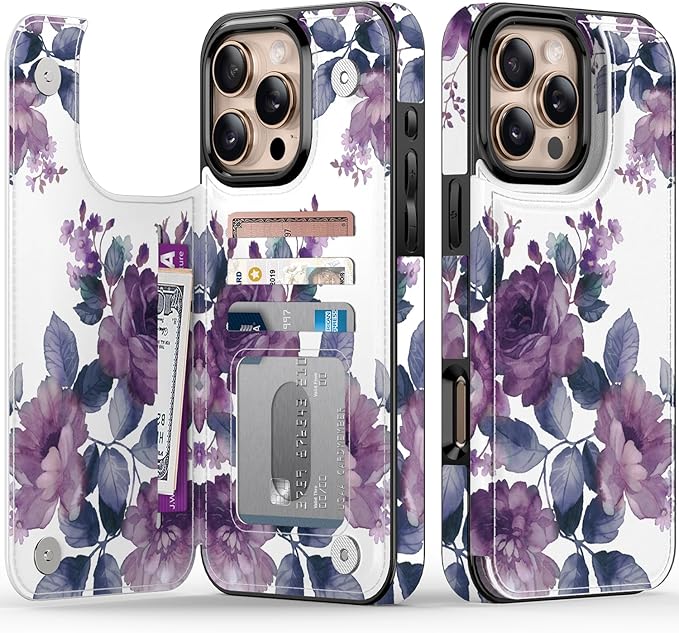 FUNMIKO for iPhone 16 Pro Max Wallet Case with Card Holder, RFID-Blocking, Military-Grade Protection & UV-Printed Artwork, Magnetic Closure with Leather Kickstand - Elegant Purple Floral