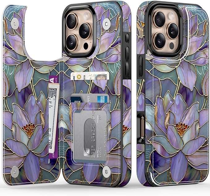 FUNMIKO for iPhone 16 Pro Wallet Case with Card Holder, RFID-Blocking, Military-Grade Protection & UV-Printed Artwork, Magnetic Closure with Leather Kickstand - Dreamy Lotus