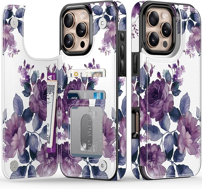 FUNMIKO for iPhone 16 Pro Wallet Case with Card Holder, RFID-Blocking, Military-Grade Protection & UV-Printed Artwork, Magnetic Closure with Leather Kickstand - Elegant Purple Floral