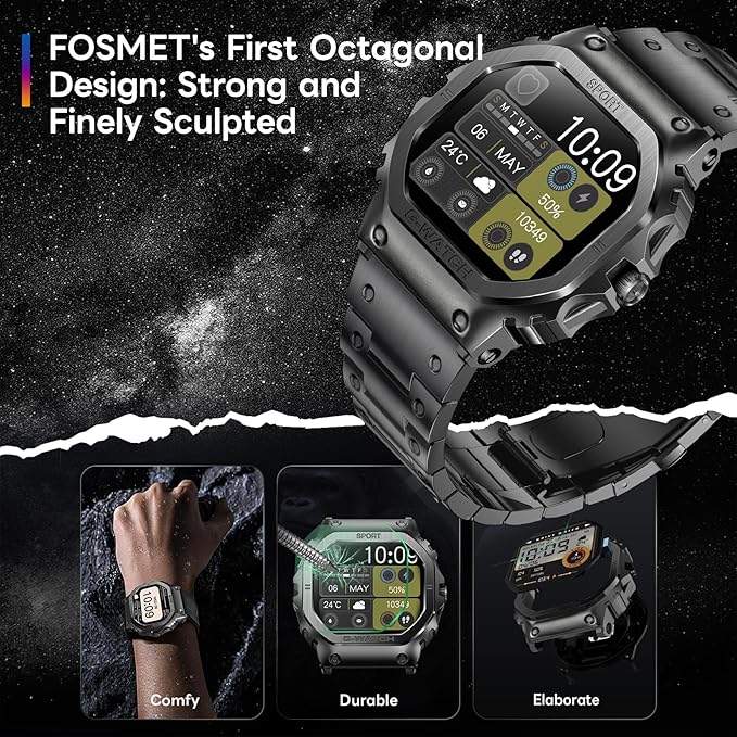 - [Comprehensive Health Assistant]The FOSMET smartwatch uses advanced sensors for more accurate health data collection. This fitness watch for men tracks heart rate, blood oxygen levels, sleep, and more. With 24-hour health monitoring, it allows you to analyze and better understand your health data. Additionally, it includes a high heart rate alert and continuous 24-hour sleep tracking.