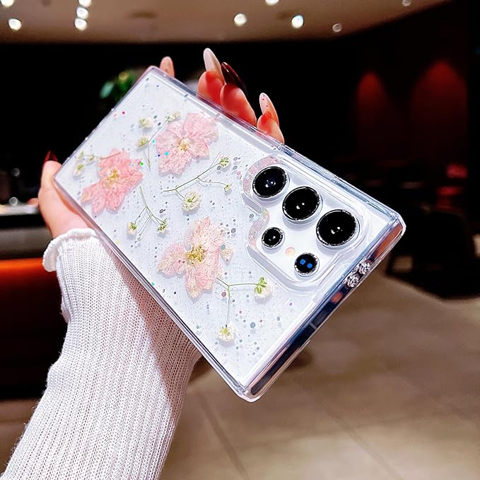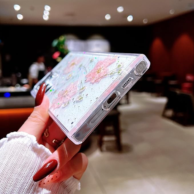 Compatible with Samsung Galaxy S23 Ultra Case Cute Pressed Dried Real Flowers Design Women Girly Shockproof Hard PC+ TPU Bumper Floral Phone Cover for Galaxy S23 Ultra (Light Pink)