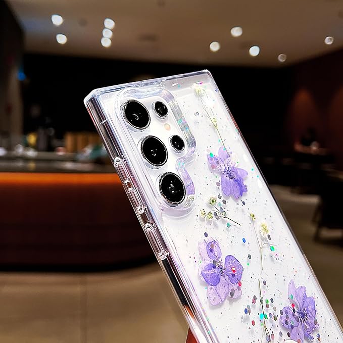 Compatible with Samsung Galaxy S23 Ultra Case Cute Pressed Dried Real Flowers Design Women Girly Shockproof Hard PC+ TPU Bumper Floral Phone Cover for Galaxy S23 Ultra (Light Purple)