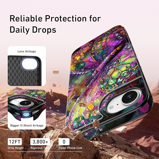 FUNMIKO for iPhone 16e Wallet Case with Card Holder, RFID-Blocking, Military-Grade Protection & UV-Printed Artwork, Magnetic Closure with Leather Kickstand - Vibrant Elegant Butterfly