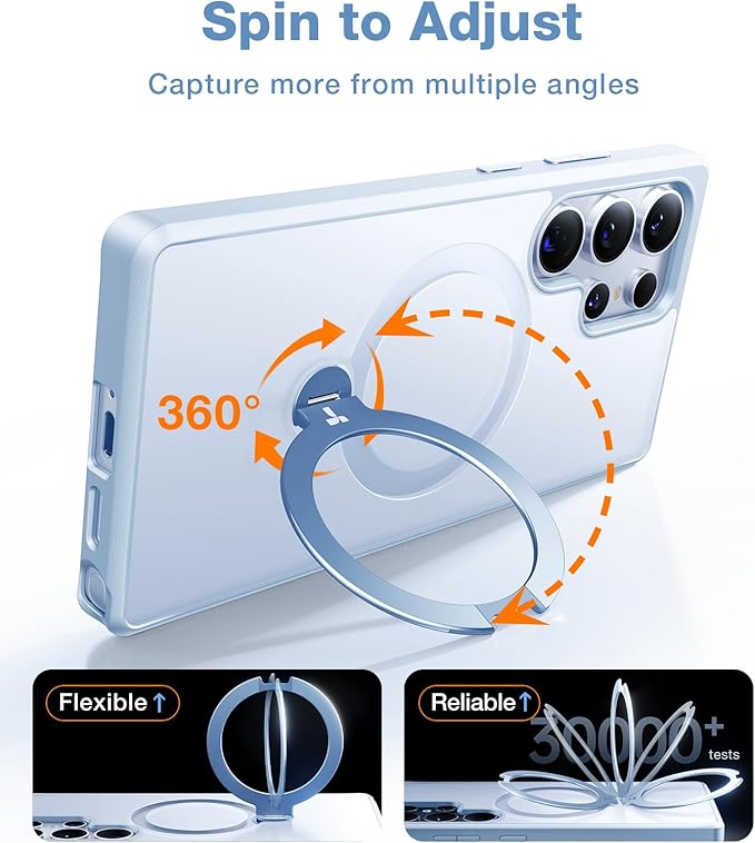 - 【Pioneering 360° Spin Stand】 This phone case for Samsung Galaxy S25 Ultra with stand offers a wider and more flexible adjustment angle: Place it in landscape mode for watching movies, adjustable to prevent screen glare. Switch to portrait mode with a unique angle up to 90°, and it can stand perfectly vertical for timer photos, like a mini tripod. No matter how high or low your desk is, just spin it boldly to achieve any of your viewing angles! Undergoing 30,000 rotation tests, the spinning stand has a longer service life than ever before