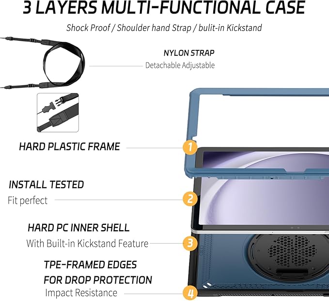 - The Galaxy Tab A9 Plus case allows ๐๐๐ฌ๐ฒ ๐๐๐๐๐ฌ๐ฌ ๐ญ๐จ ๐๐ฅ๐ฅ ๐๐ฎ๐ญ๐ญ๐จ๐ง๐ฌ, ๐๐จ๐ง๐ญ๐ซ๐จ๐ฅ๐ฌ ๐๐ง๐ ๐ฉ๐จ๐ซ๐ญ๐ฌ without having to remove the iPad from the case. Shock prevention keeps away from shocks, port covers of the case prevent dust from entering into tablet.