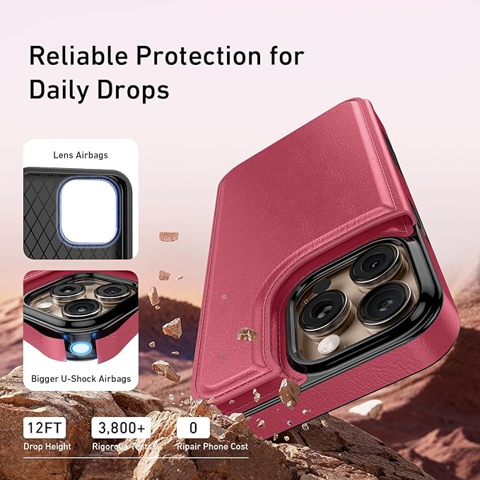 - Military-Grade MIL-STD-810G Protection - Crafted with premium leather and reinforced shock-absorbent corners, this iPhone 16 Pro case offers military-grade MIL-STD-810G protection against drops of up to 1.2 meters, making it ideal for daily adventures or accidental slips. Additionally, it features a 5,000+ cycle magnetic clasp for instant, secure closure and 45° to 90° adjustable kickstand for binge-watching, video calls, or reading—all designed for convenient one-hand operation.