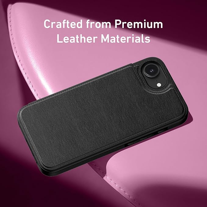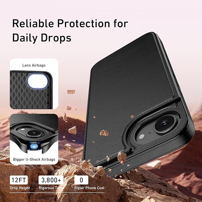 - Military-Grade MIL-STD-810G Protection - Crafted with premium leather and reinforced shock-absorbent corners, this iPhone 16e case offers military-grade MIL-STD-810G protection against drops of up to 1.2 meters, making it ideal for daily adventures or accidental slips. Additionally, it features a 5,000+ cycle magnetic clasp for instant, secure closure and 45° to 90° adjustable kickstand for binge-watching, video calls, or reading—all designed for convenient one-hand operation.