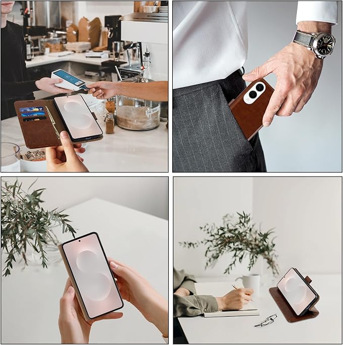 - All-around Protection: This Samsung S25 Edge wallet case consists of a premium leather outer shell and a TPU inner shell. The outer leather has a luxurious and natural texture that is comfortable to the touch and protects against scratches and fingerprints. The soft and durable TPU inner shell with raised S25 Edges and cushioning design provides all-around protection for your phone, even if it is dropped from a high place without any damage.