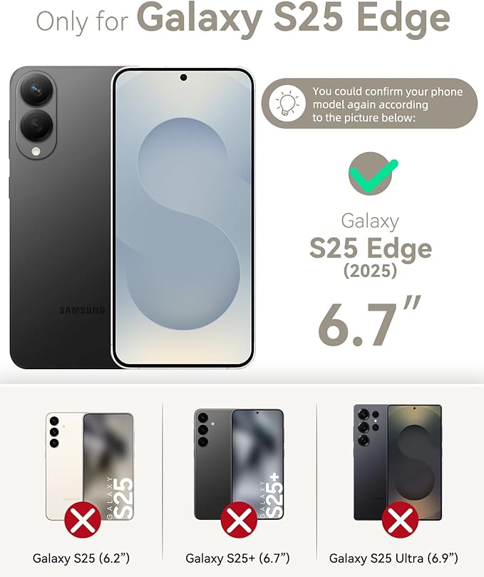 - Compatibility: This case is only compatible for Samsung Galaxy S25 edge (6.7-inch display, 2025 new releases). Before purchasing, please check your phone model before you purchase this case. It will not fit other phone models