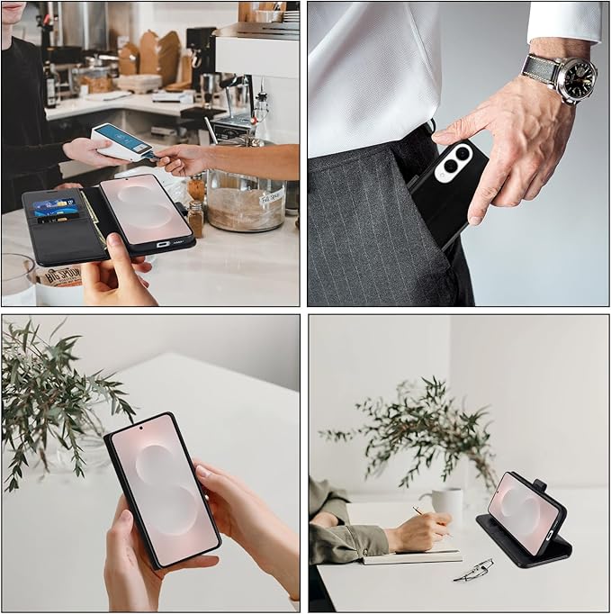 - All-around Protection: This Samsung S25 Edge wallet case consists of a premium leather outer shell and a TPU inner shell. The outer leather has a luxurious and natural texture that is comfortable to the touch and protects against scratches and fingerprints. The soft and durable TPU inner shell with raised S25 Edges and cushioning design provides all-around protection for your phone, even if it is dropped from a high place without any damage.