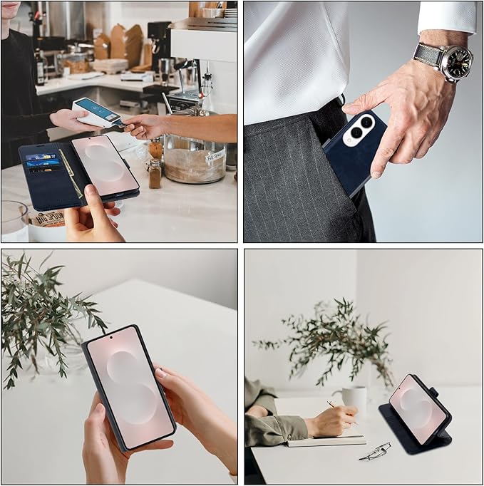 - All-around Protection: This Samsung S25 Edge wallet case consists of a premium leather outer shell and a TPU inner shell. The outer leather has a luxurious and natural texture that is comfortable to the touch and protects against scratches and fingerprints. The soft and durable TPU inner shell with raised S25 Edges and cushioning design provides all-around protection for your phone, even if it is dropped from a high place without any damage.