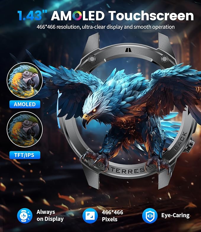 - đź‘‘ AMOLED Brilliance, Customizable Dials - The ESFOE 2025 smartwatch for men features an energy-efficient 1.43-inch full-circle AMOLED display with a 60Hz adaptive refresh rate, 466x466 pixel resolution, 100% RGB color space, and a maximum brightness of 1000 NIT, offering a wider, clearer, and brighter display. The always-on function allows you to check the time without raising your wrist or touching the screen. This Android smartwatch is equipped with 7+3 UI slots (7 local dials and 3 slots for online dials). With the Gloryfitpro app, you can choose from over 200 online dials and customize the style as desired.
