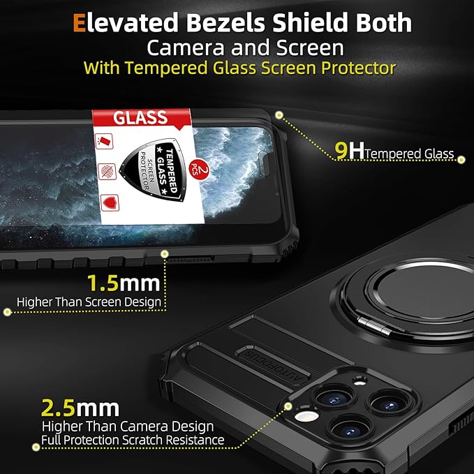 for iPhone 11 Pro Max Case Magnetic Compatible with MagSafe,with 2 Screen Protector,Built-in Camera Cover+Kickstand Ring,Military Grade Drop Shockproof Heavy Duty Protection Phone Bumper Black