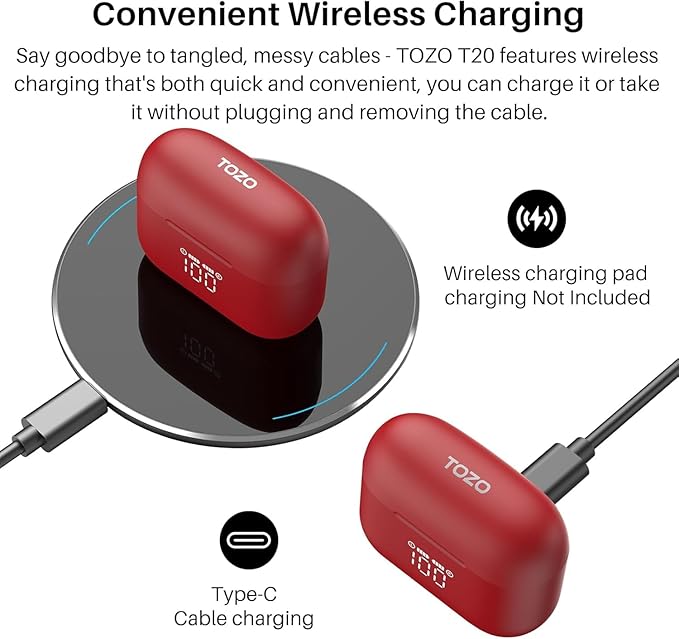TOZO T20 Wireless Earbuds Bluetooth Headphones 48.5 Hrs Playtime with LED Digital Display, IPX8 Waterproof, Dual Mic Call Noise Cancelling 10mm Broad Range Speakers with Wireless Charging Case