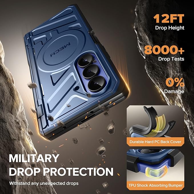 - [Upgraded Elastic Soft TPU & Robust Durable PC for Military Drop Protection] This Z Fold7 case consists of a high strength tough PC back cover and a upgraded elasticity, wear-resistant TPU shock absorbing bumper frame, with a dual-layer shockproof and rugged construction. The case provides reliable protection for your phone against severe drops, impacts, and collisions. Our cases exceed the military shock specification standard and have been drop tested at 12 feet and 16 feet
