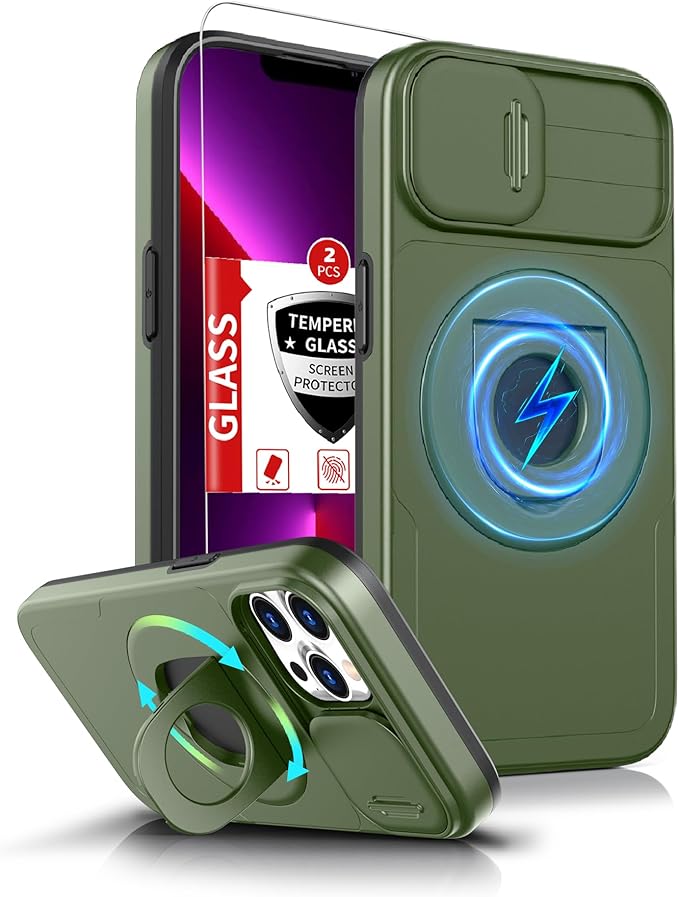 for iPhone 13 Pro Max Case Compatible with MagSafe Magnetic,with 2 Screen Protector,with Camera Cover&360°Kickstand Ring,Military Grade Drop Shockproof Heavy Duty Protection Phone Bumper Green